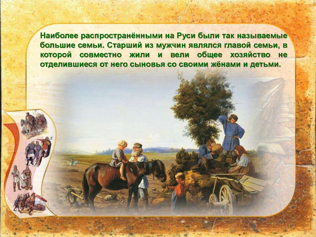 Наиболее распространёнными на Руси были так называемыебольшие семьи. Старший из мужчин являлся главой семьи, в