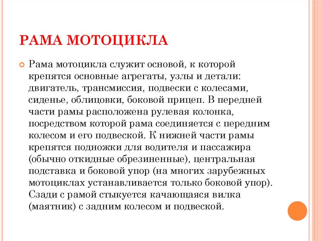 Рама мотоцикла служит основой, к которойкрепятся основные агрегаты, узлы и детали: