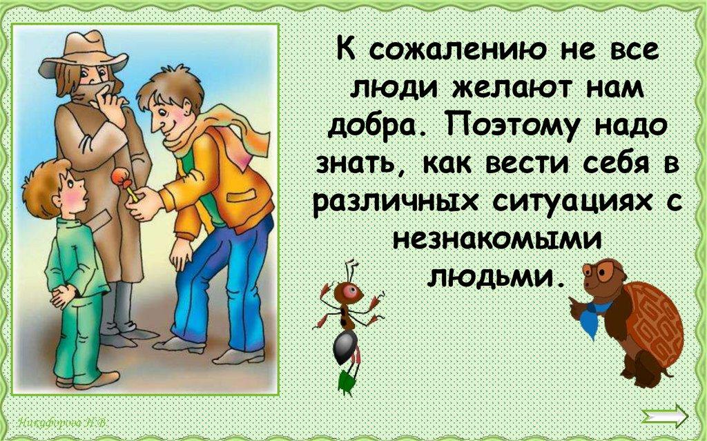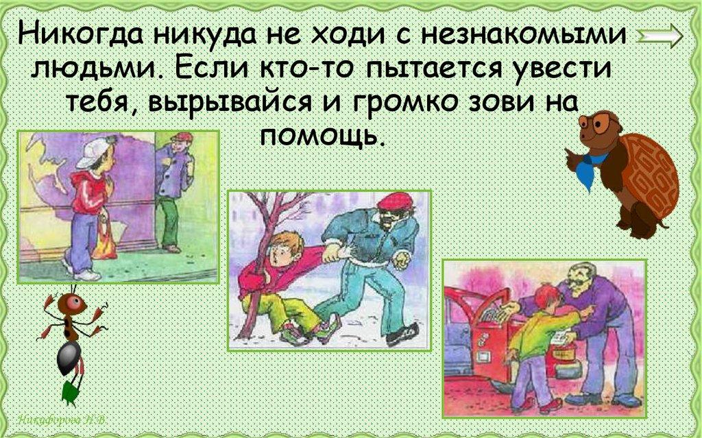 Никогда никуда не ходи с незнакомымилюдьми. Если кто-то пытается увести