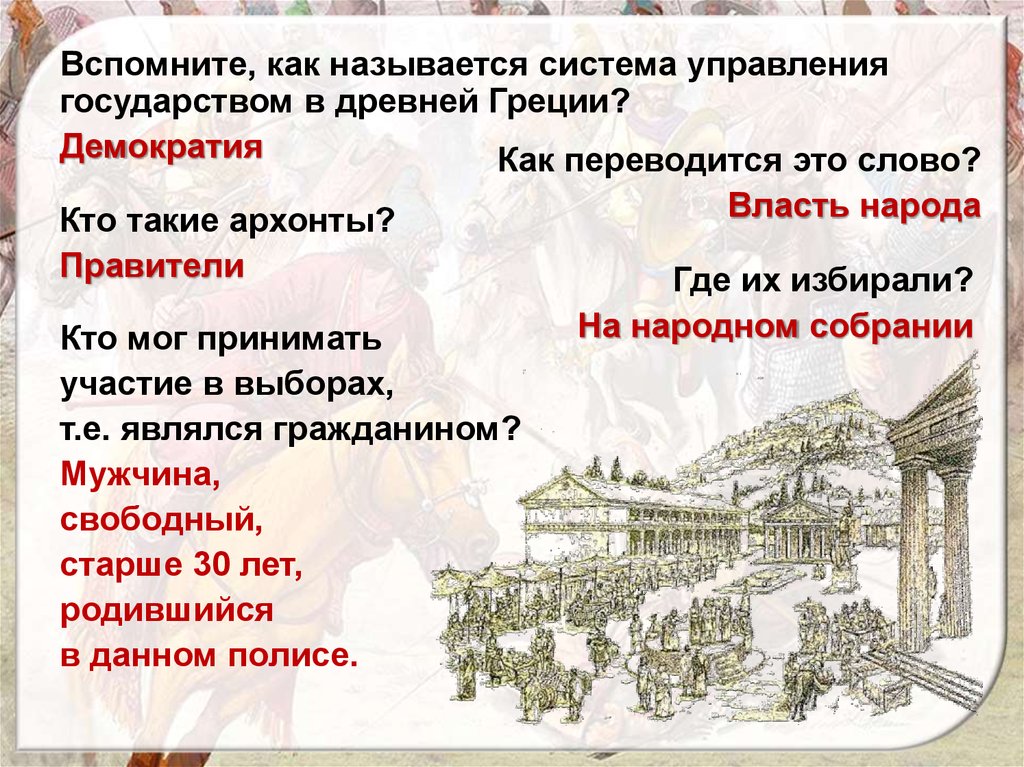 Вспомните, как называется система управлениягосударством в древней Греции?
