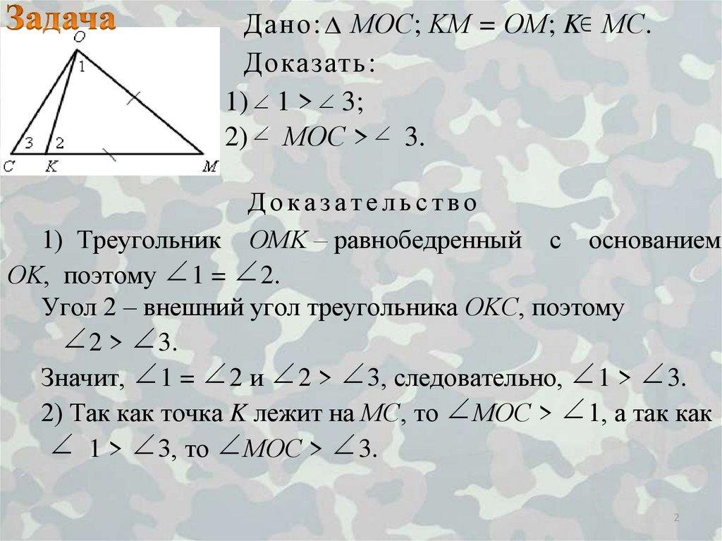 поэтому 2> B. Углы 1 и 2 равны как углы при основании