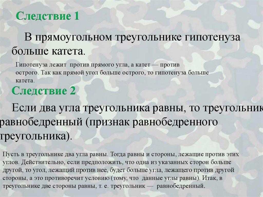 Следствие 1В прямоугольном треугольнике гипотенуза