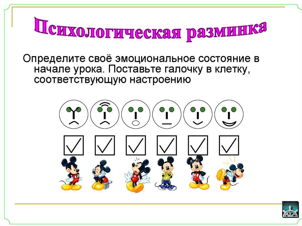 Определите своё эмоциональное состояние вначале урока. Поставьте галочку в клетку,