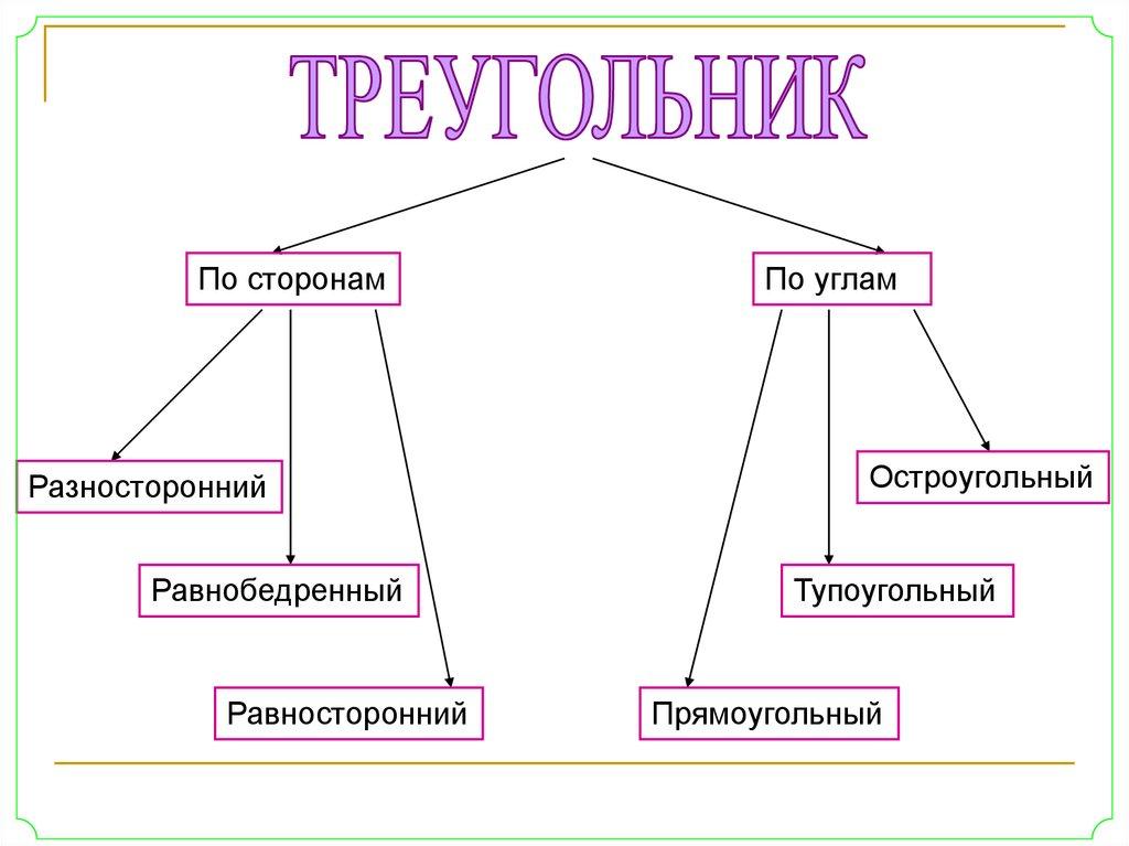 остроугольный треугольник, в котором все углы острые;тупоугольный треугольник, в котором один из углов