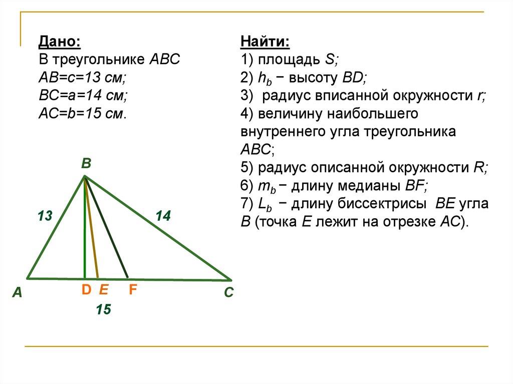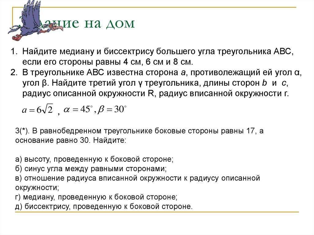 Задание на дом1. Найдите медиану и биссектрису большего угла треугольника АВС,