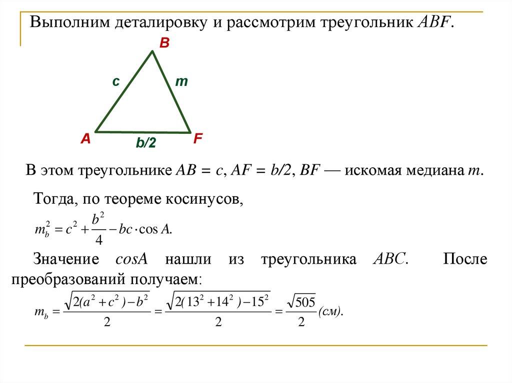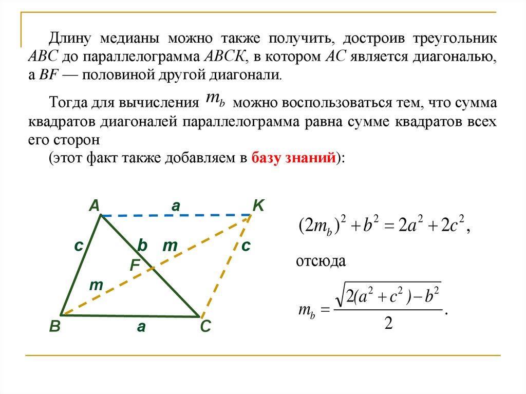Длину медианы можно также получить, достроив треугольникАВС до параллелограмма АВСК, в котором АС является диагональю,