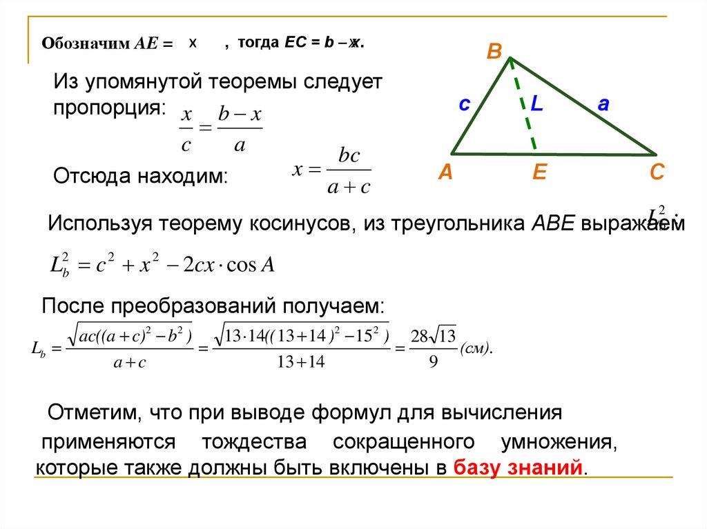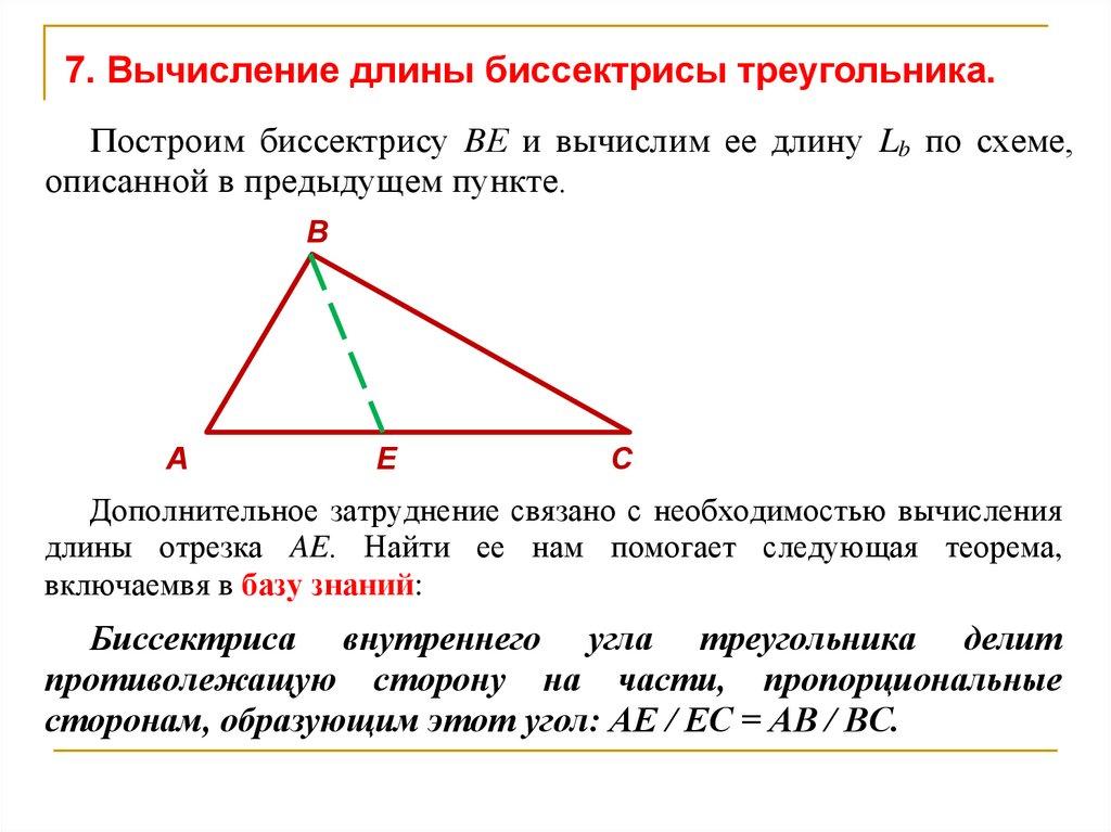 7. Вычисление длины биссектрисы треугольника.Построим биссектрису BЕ и вычислим ее длину Lb по схеме,