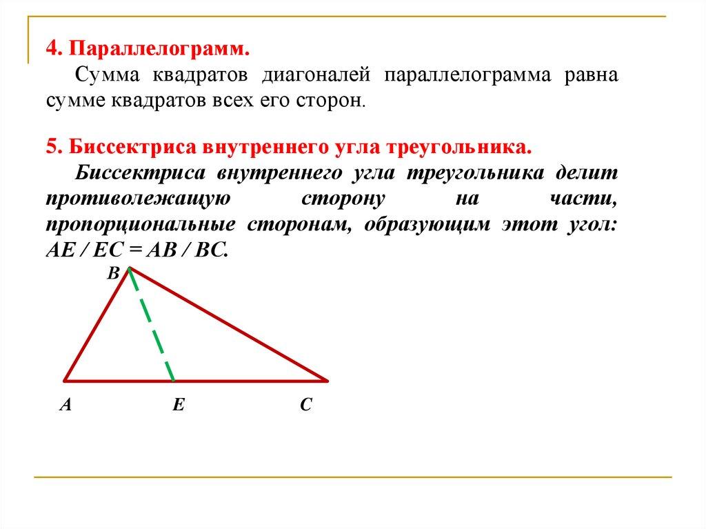 4. Параллелограмм.Сумма квадратов диагоналей параллелограмма равна