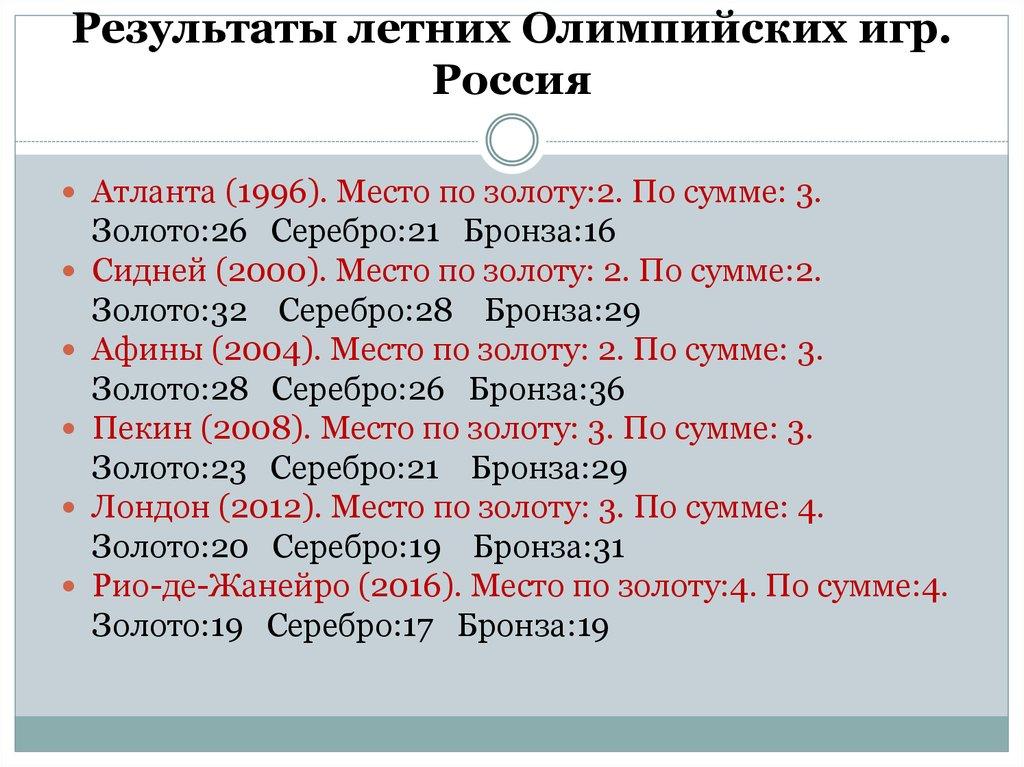 26. Результаты летних Олимпийских игр. Россия
