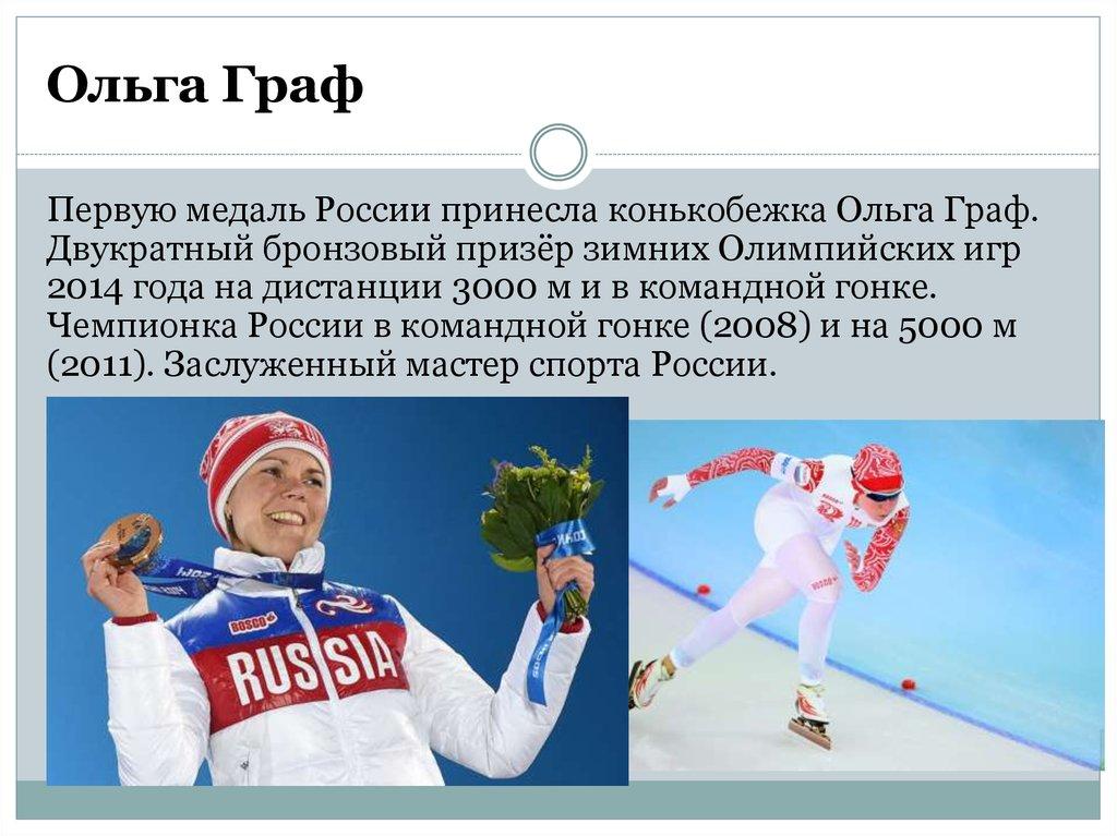 Первую медаль России принесла конькобежка Ольга Граф.Двукратный бронзовый призёр зимних Олимпийских игр