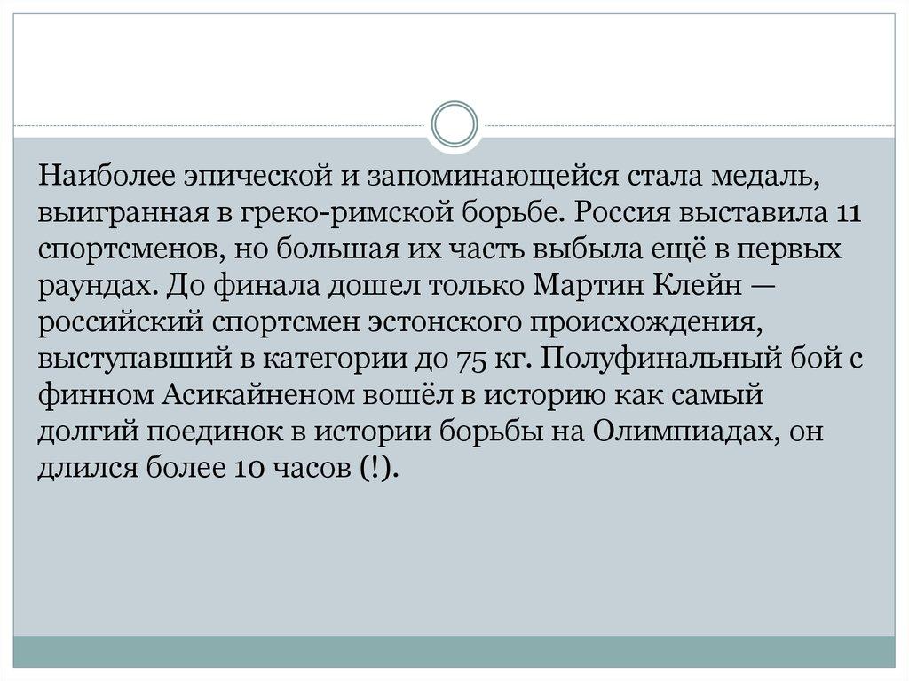 Наиболее эпической и запоминающейся стала медаль,выигранная в греко-римской борьбе. Россия выставила 11