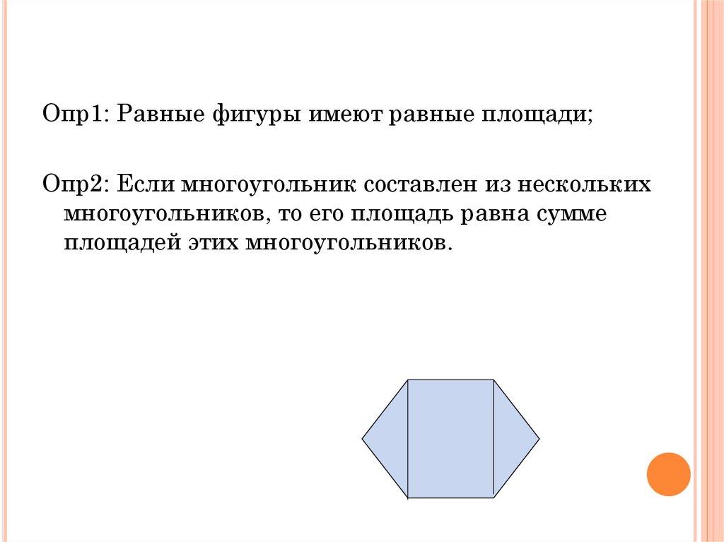 Опр1: Равные фигуры имеют равные площади;Опр2: Если многоугольник составлен из нескольких