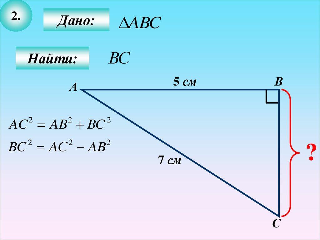 4. Запишите теорему Пифагора для треугольника АВС, у которого угол В прямой.