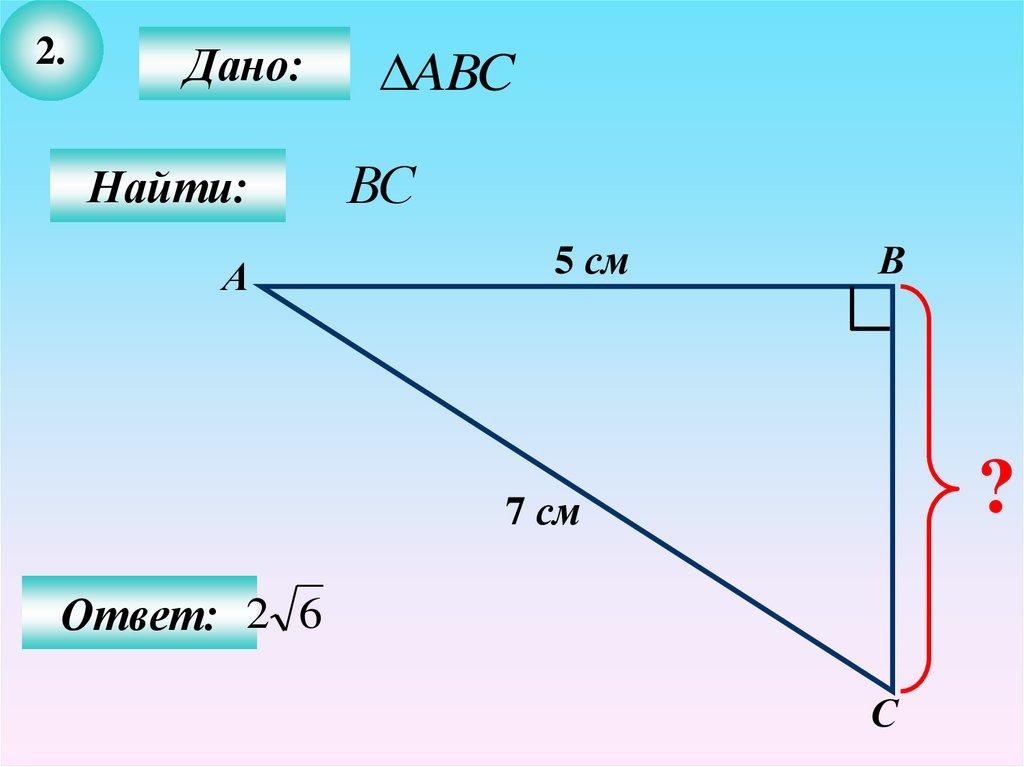 2. Гипотенуза прямоугольного треугольника равна 5 см, а один из катетов 3 см.