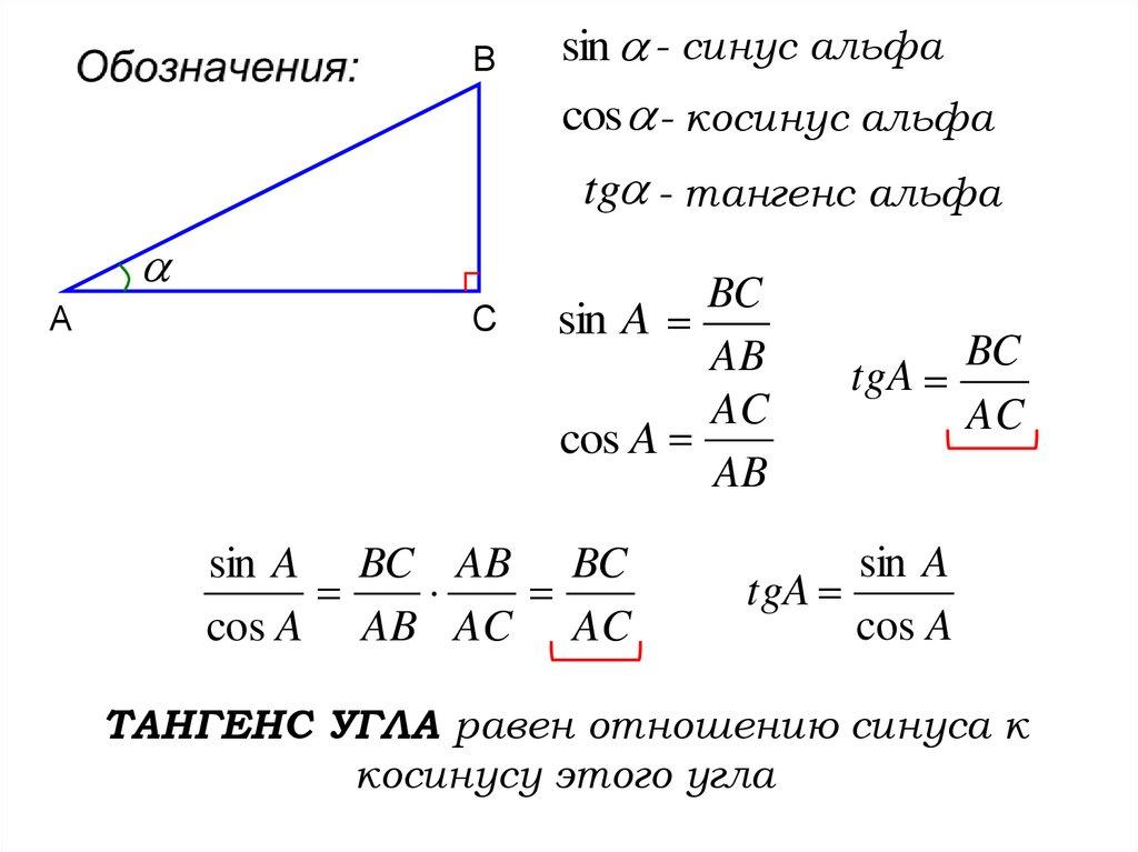 ТАНГЕНС УГЛА равен отношению синуса к