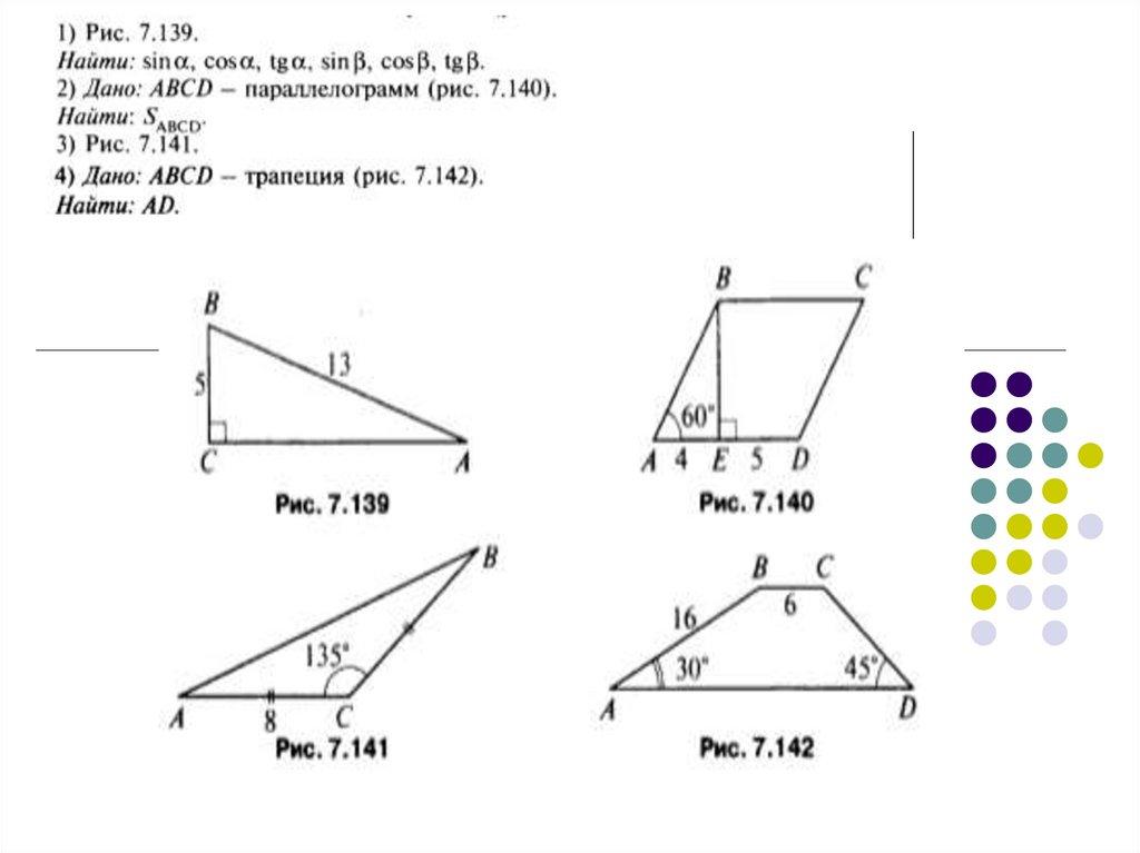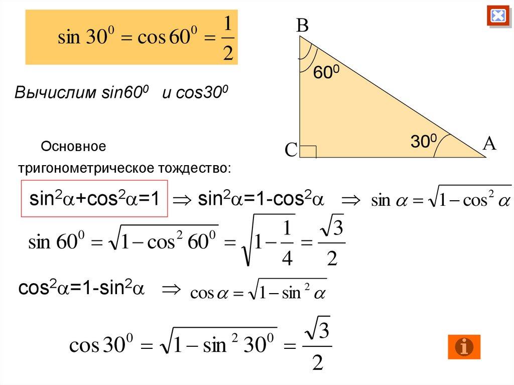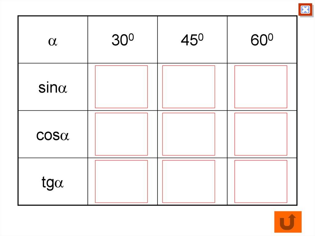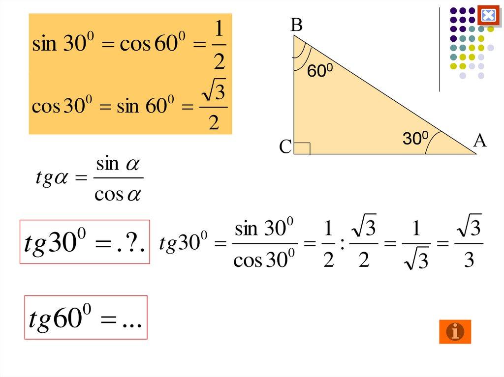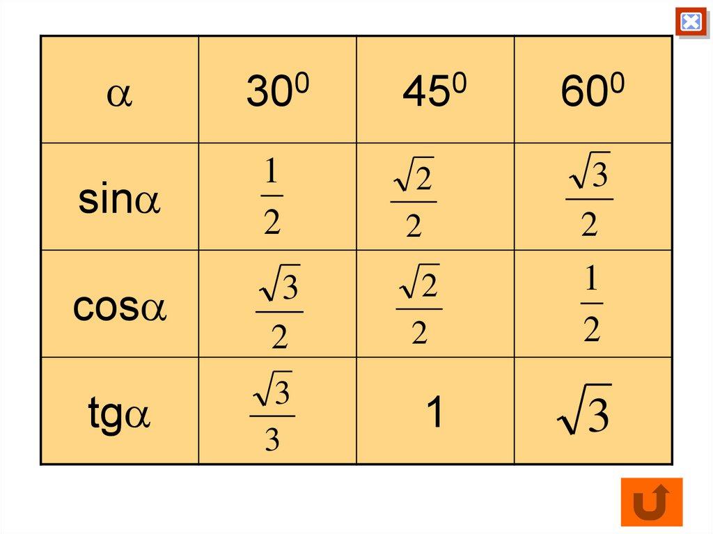 38. Значения синуса, косинуса и тангенса для углов 300, 450, 600.