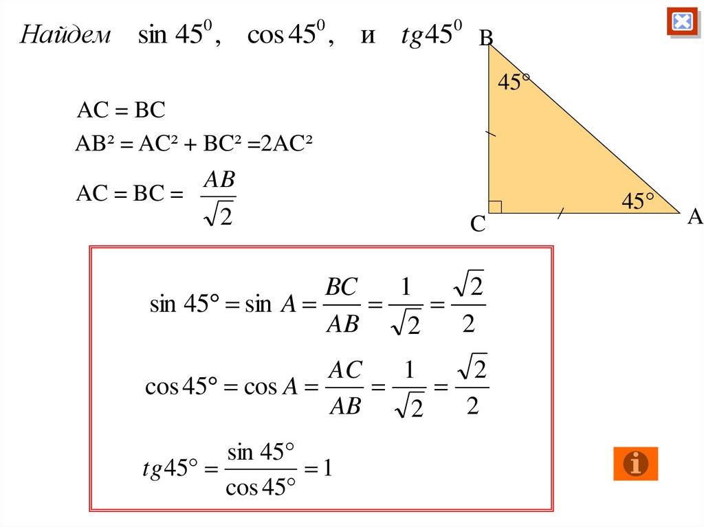 Найдем sin 450 , cos 450 , и tg 450 B45°
