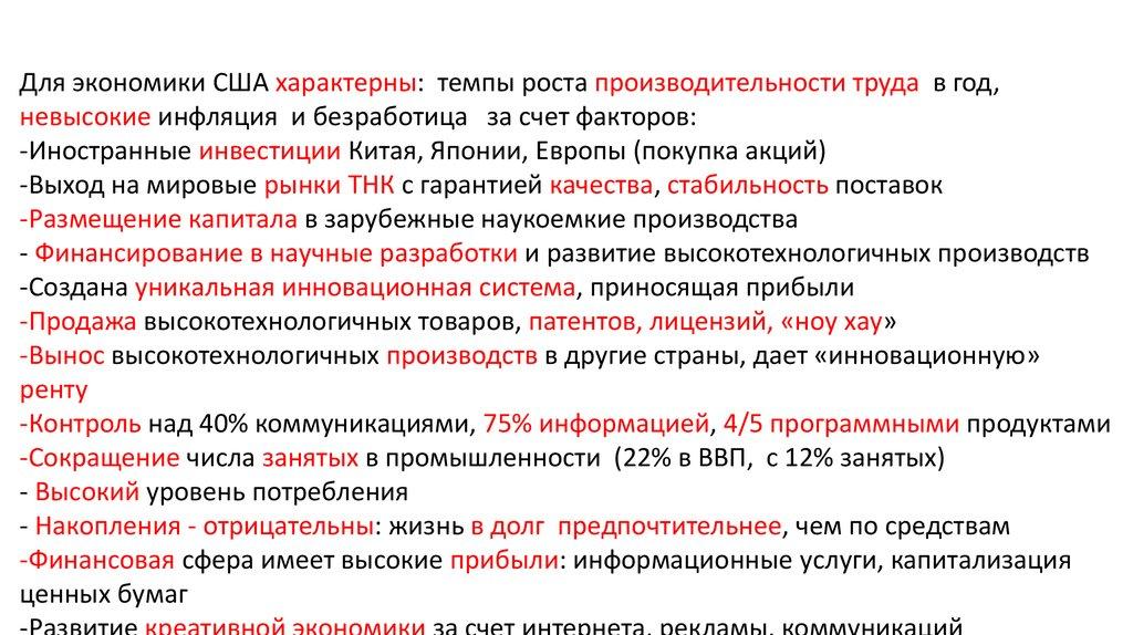 Для экономики США характерны: темпы роста производительности труда в год, невысокие инфляцияи безработица за счет факторов: