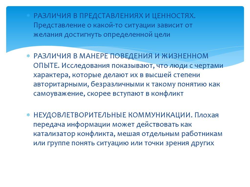 РАЗЛИЧИЯ В ПРЕДСТАВЛЕНИЯХ И ЦЕННОСТЯХ.Представление о какой-то ситуации зависит от