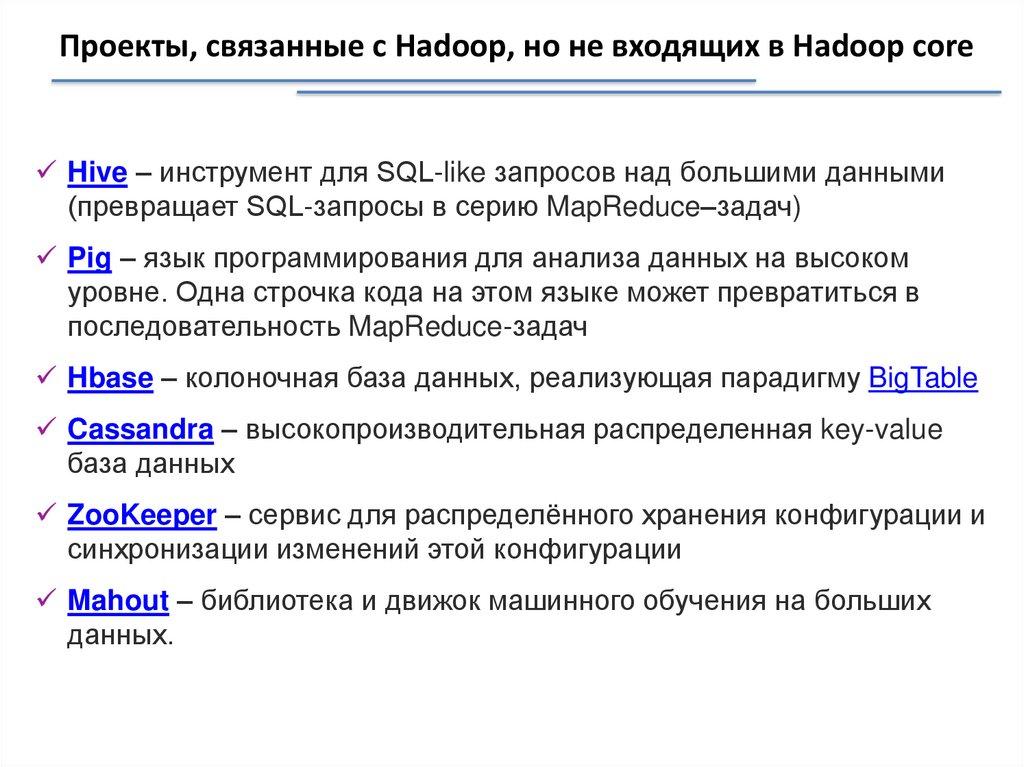 Проекты, связанные с Hadoop, но не входящих в Hadoop coreHive – инструмент для SQL-like запросов над большими данными