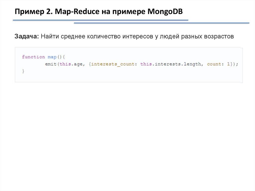 Пример 2. Map-Reduce на примере MongoDBЗадача: Найти среднее количество интересов у людей разных возрастов