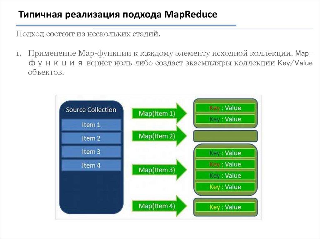 1. Применение Map-функции к каждому элементу исходной коллекции. Mapфункция вернет ноль либо создаст экземпляры коллекции Key/Value
