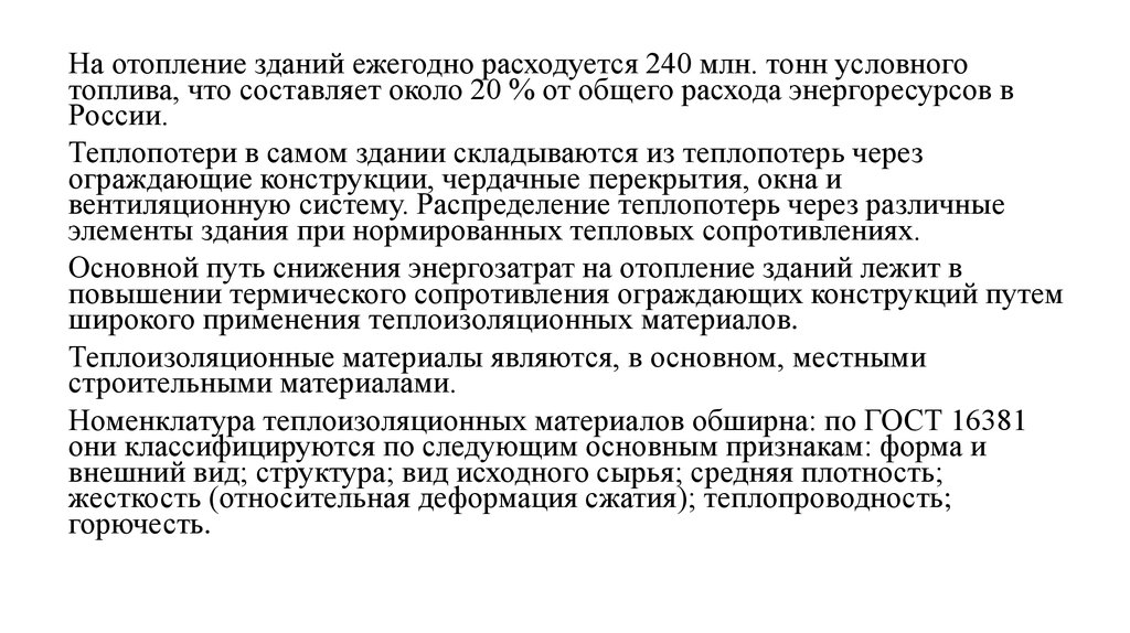 На отопление зданий ежегодно расходуется 240 млн. тонн условноготоплива, что составляет около 20 % от общего расхода энергоресурсов в