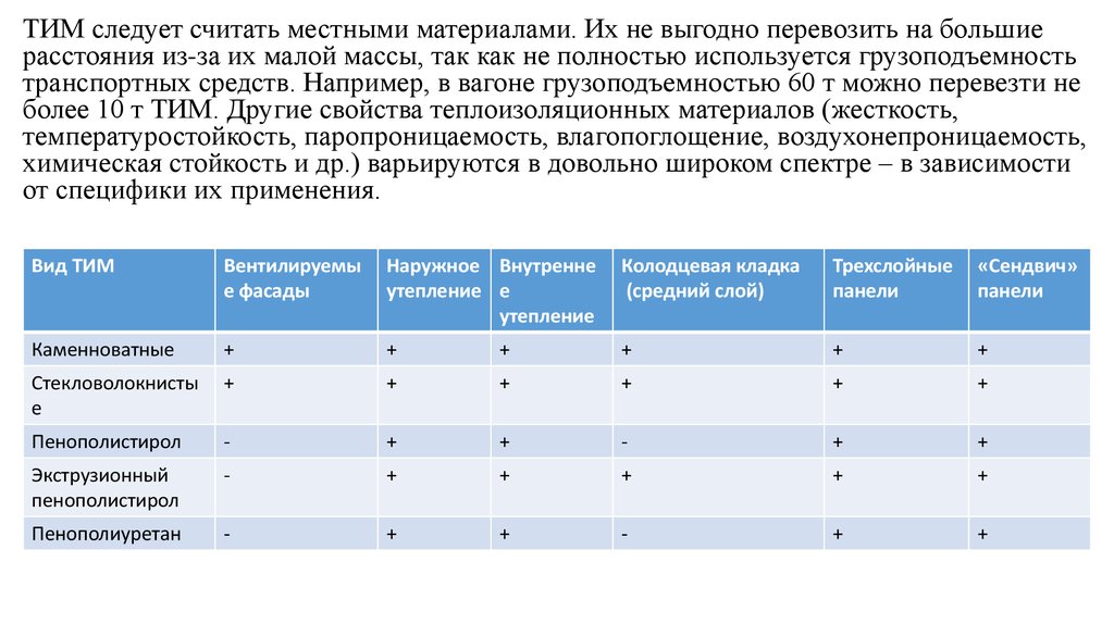 ТИМ следует считать местными материалами. Их не выгодно перевозить на большиерасстояния из-за их малой массы, так как не полностью используется грузоподъемность