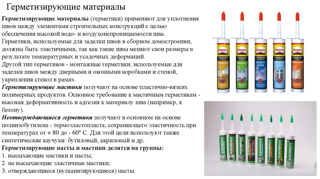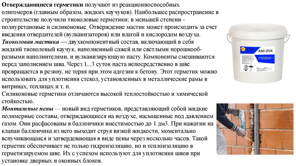 строительстве получили тиоколовые герметики; в меньшей степени полиуретановые и силиконовые. Отверждение мастик может происходить за счет