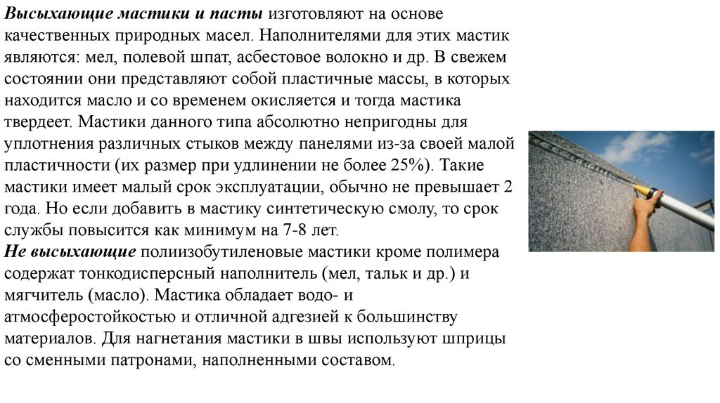 полимерных продуктов. Основное требование к мастичным герметикам высокая деформативность и адгезия к материалу шва (например, к
