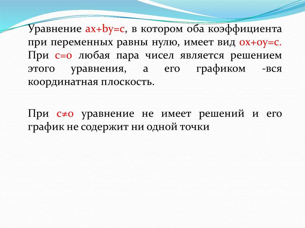 Уравнение ax+by=c, в котором оба коэффициентапри переменных равны нулю, имеет вид 0x+0y=c.