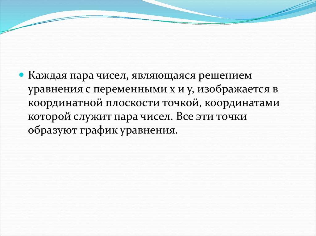 Каждая пара чисел, являющаяся решениемуравнения с переменными х и у, изображается в