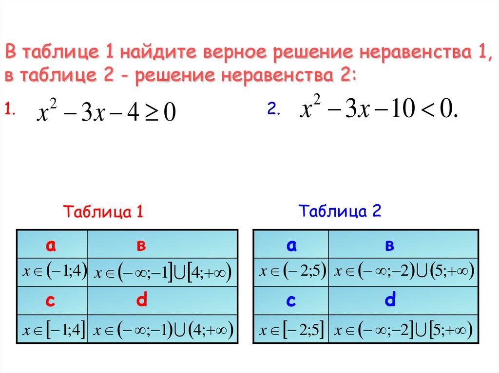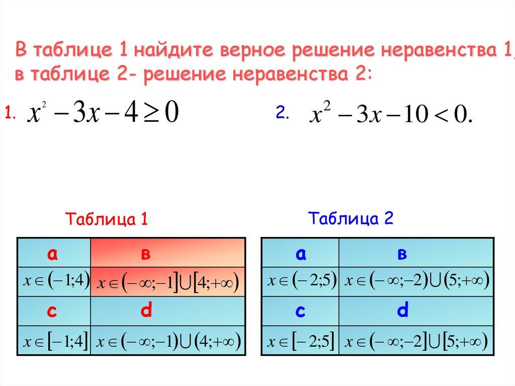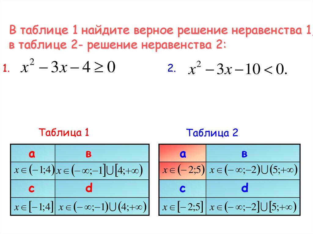 В таблице 1 найдите верное решение неравенства 1,в таблице 2- решение неравенства 2:
