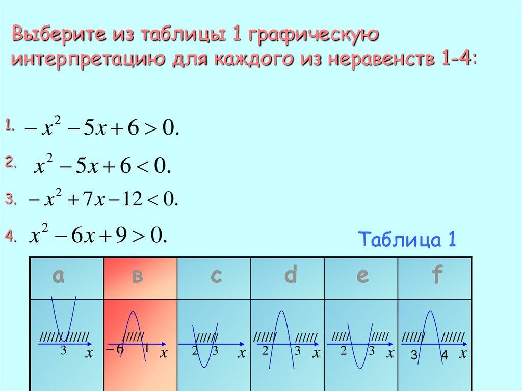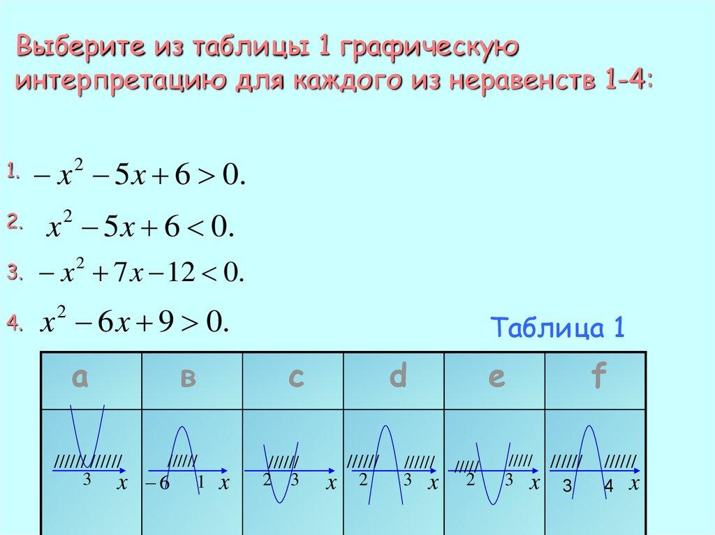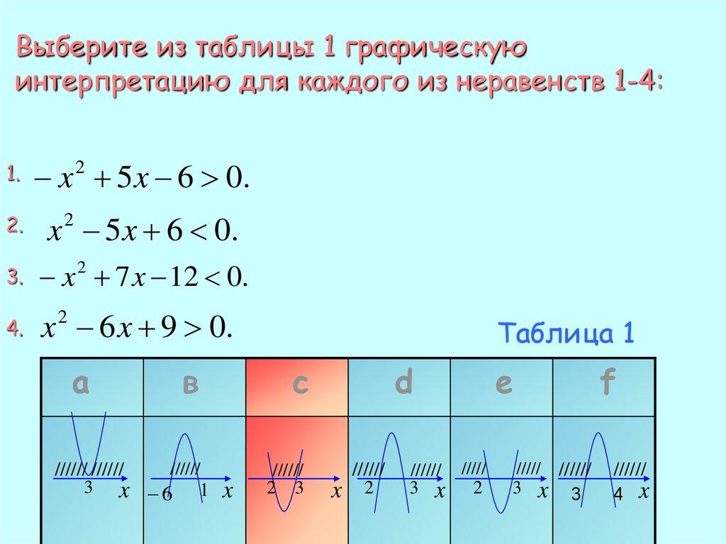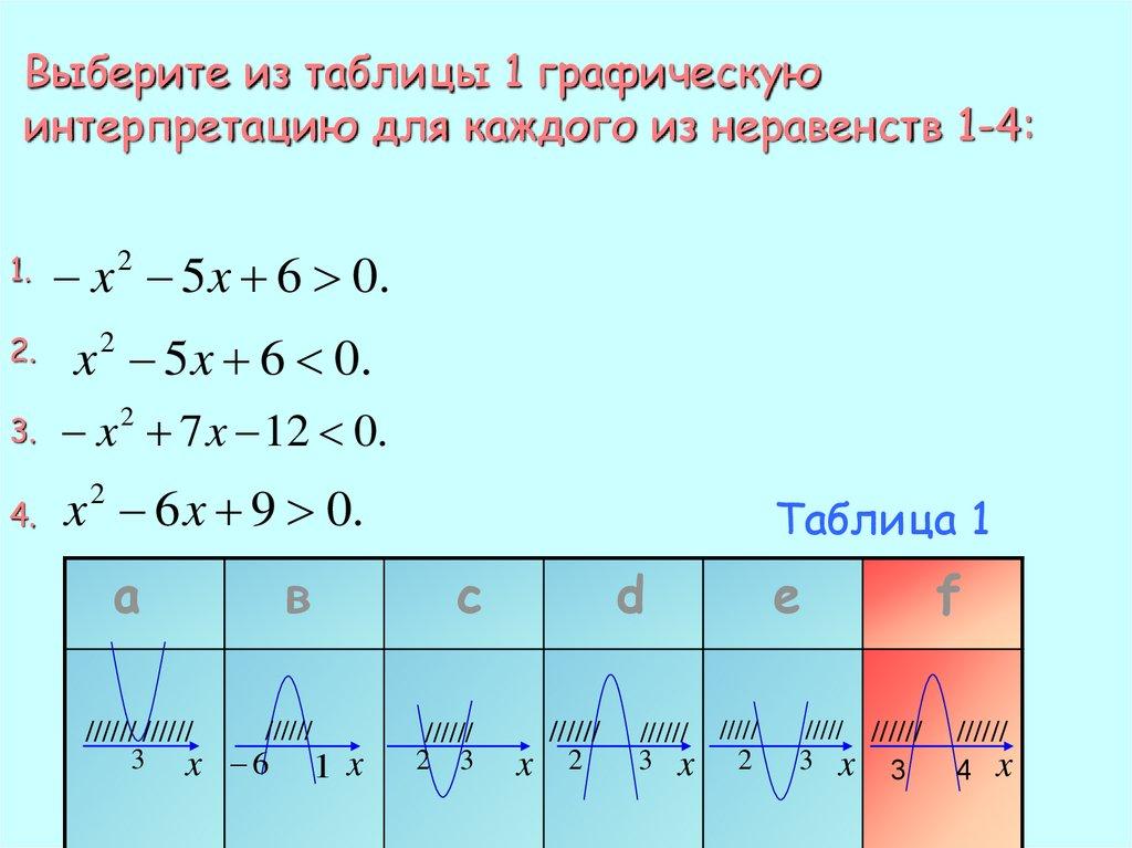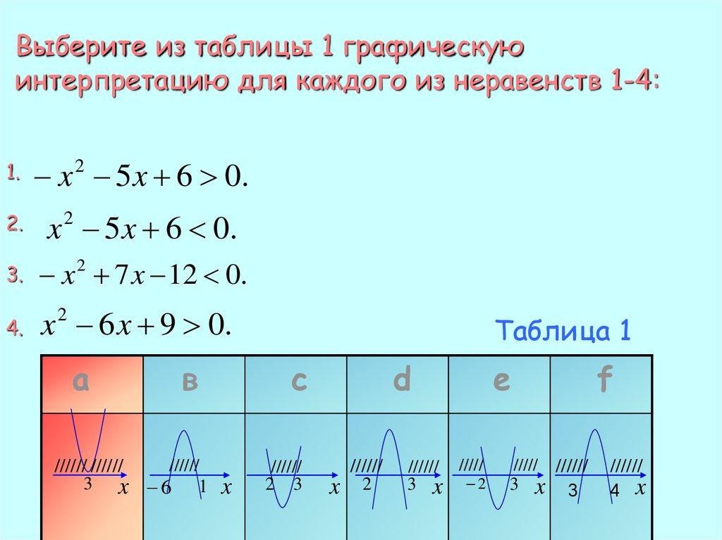 Выберите из таблицы 1 графическуюинтерпретацию для каждого из неравенств 1-4: