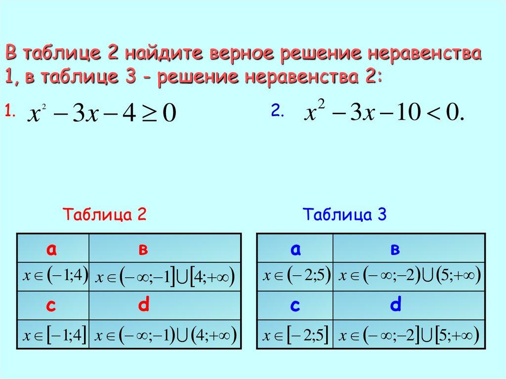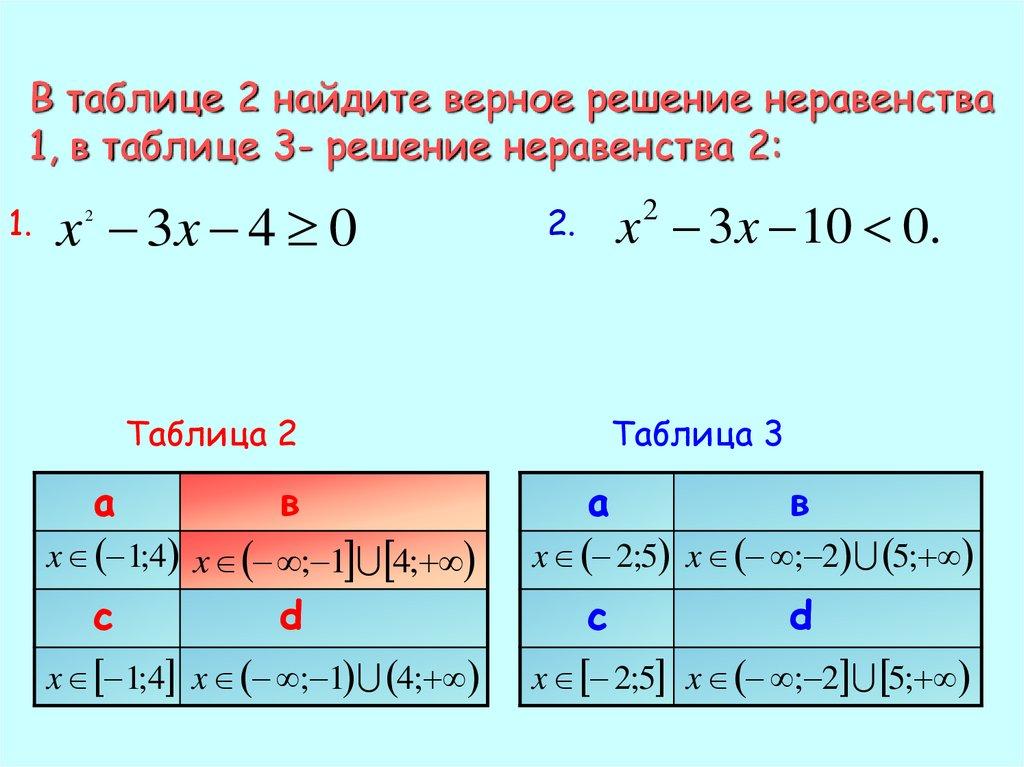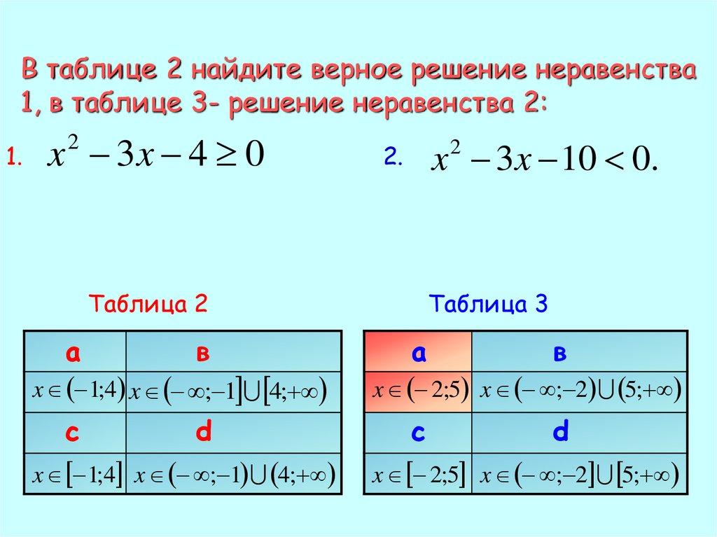 В таблице 2 найдите верное решение неравенства1, в таблице 3- решение неравенства 2: