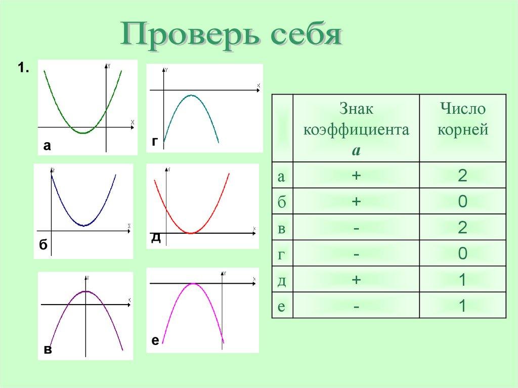 1. 1. Назовите число корней уравнения ax2+bx+c=0 и знак коэффициента а, если график соответствующей квадратичной функции