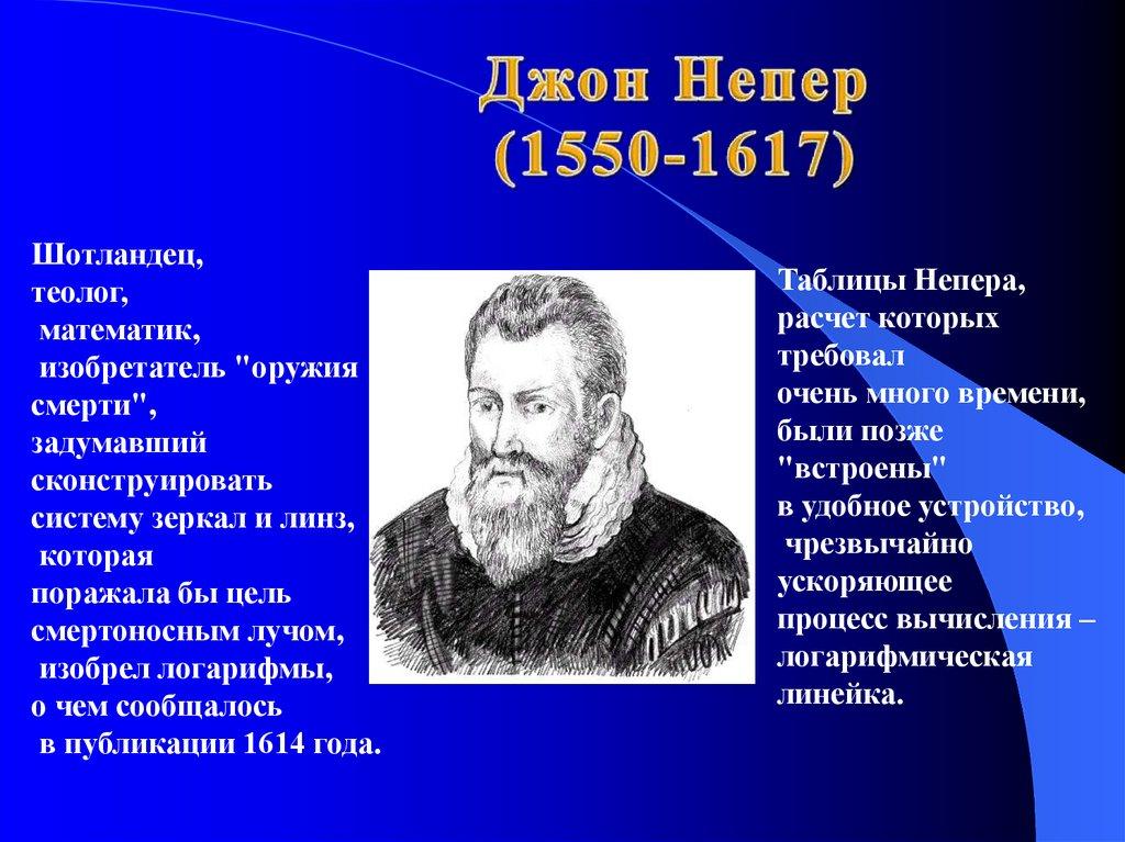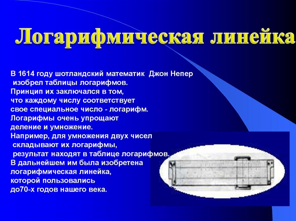 В 1614 году шотландский математик Джон Неперизобрел таблицы логарифмов.