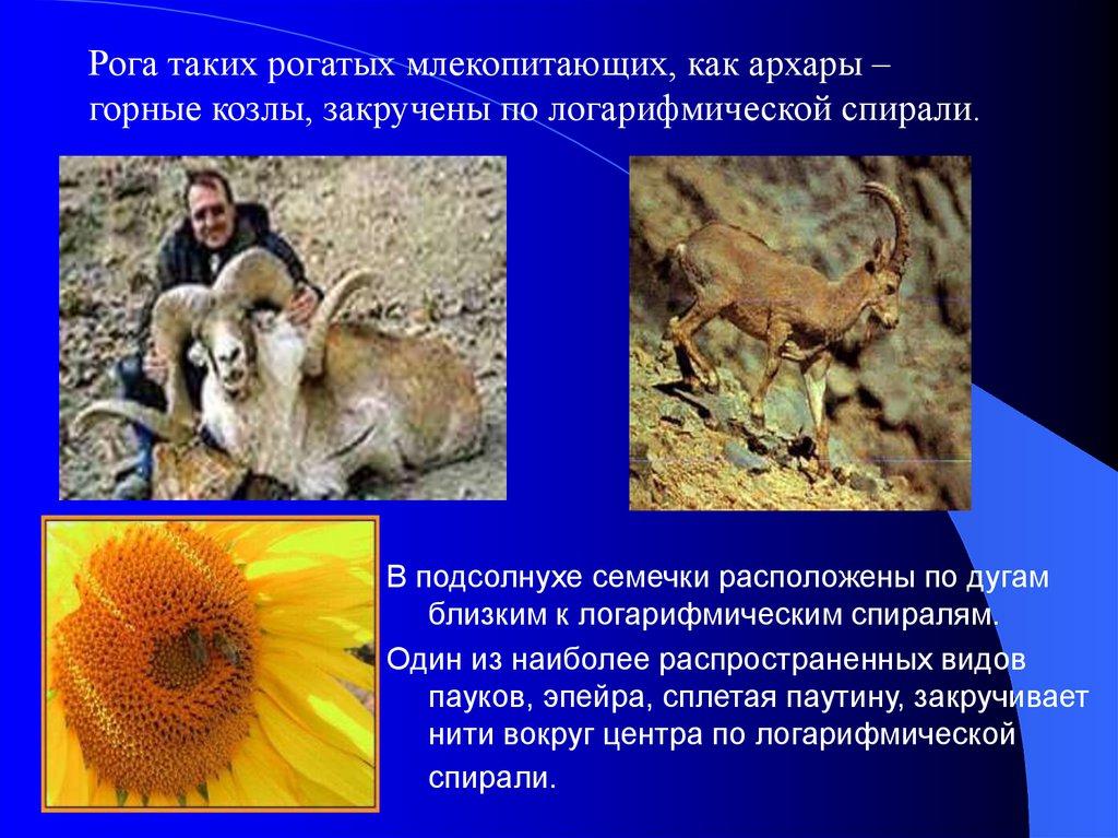 Рога таких рогатых млекопитающих, как архары –горные козлы, закручены по логарифмической спирали.
