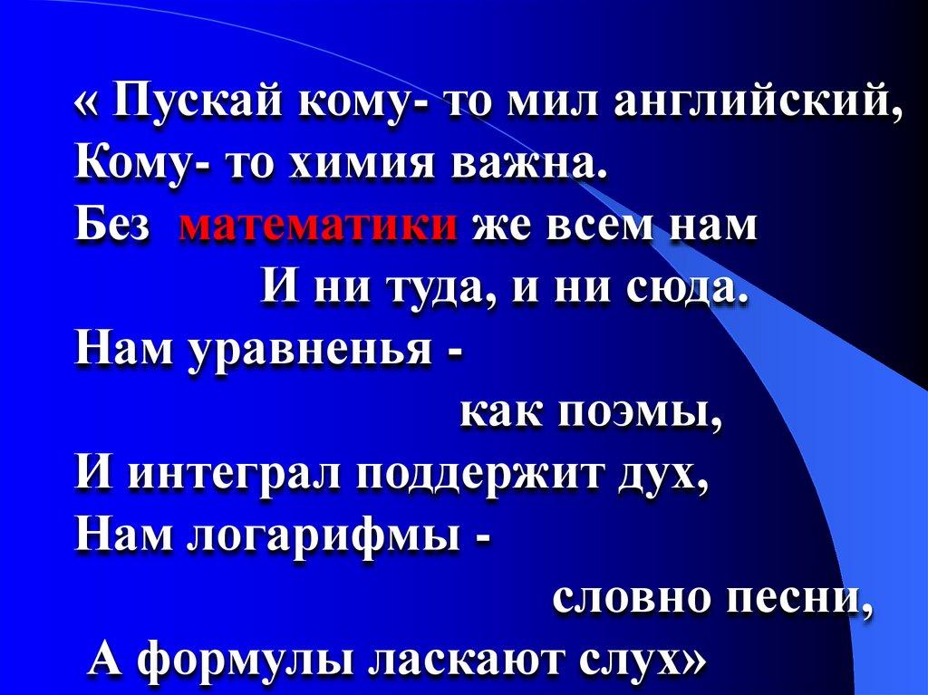 « Пускай кому- то мил английский,Кому- то химия важна.