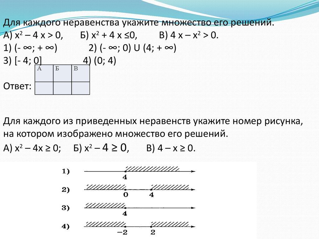 Для каждого неравенства укажите множество его решений.А) х2 – 4 х > 0,