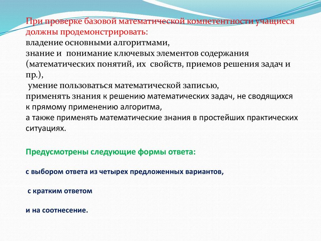 При проверке базовой математической компетентности учащиесядолжны продемонстрировать: