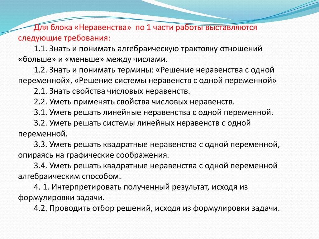 Для блока «Неравенства» по 1 части работы выставляютсяследующие требования: