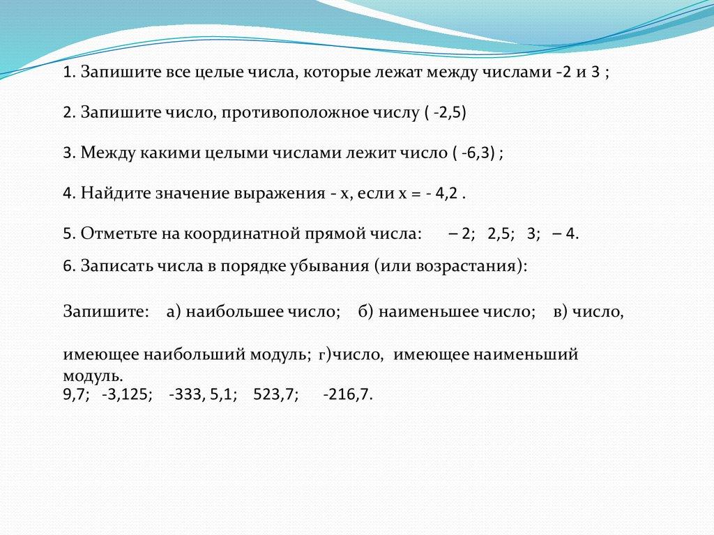 1. Запишите все целые числа, которые лежат между числами -2 и 3 ;2. Запишите число, противоположное числу ( -2,5)