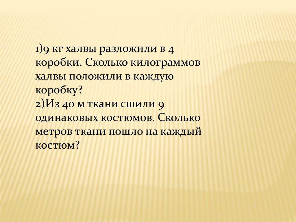 1)9 кг халвы разложили в 4коробки. Сколько килограммов