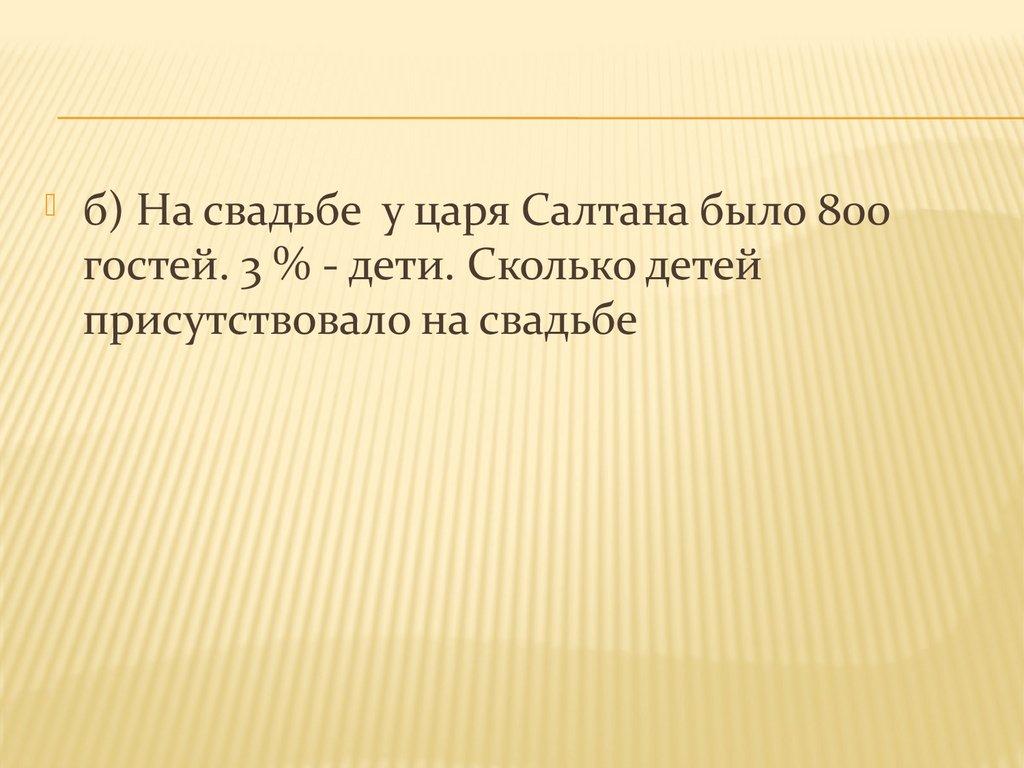 б) На свадьбе у царя Салтана было 800гостей. 3 % - дети. Сколько детей