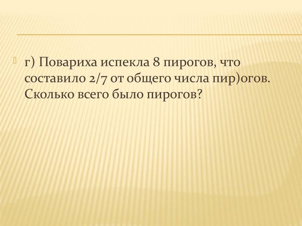г) Повариха испекла 8 пирогов, чтосоставило 2/7 от общего числа пир)огов.