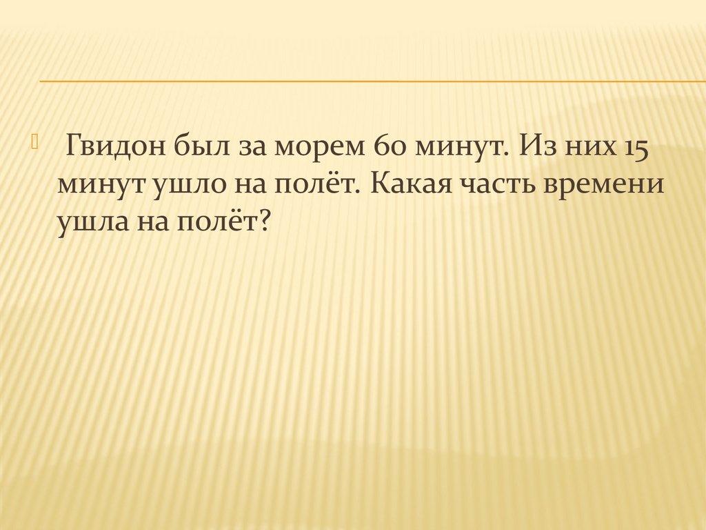 Гвидон был за морем 60 минут. Из них 15минут ушло на полёт. Какая часть времени