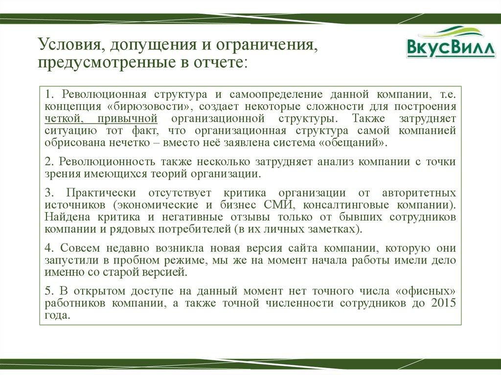Условия, допущения и ограничения,предусмотренные в отчете: