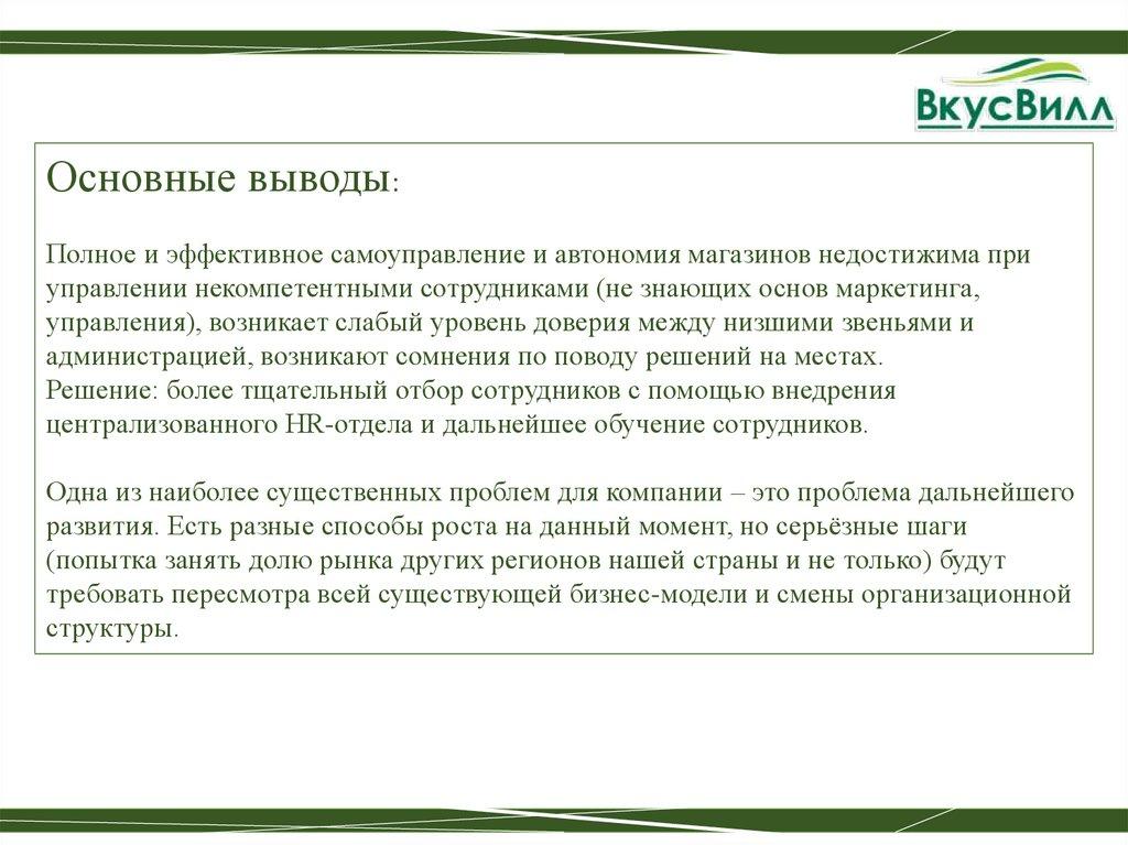 Основные выводы:Полное и эффективное самоуправление и автономия магазинов недостижима при