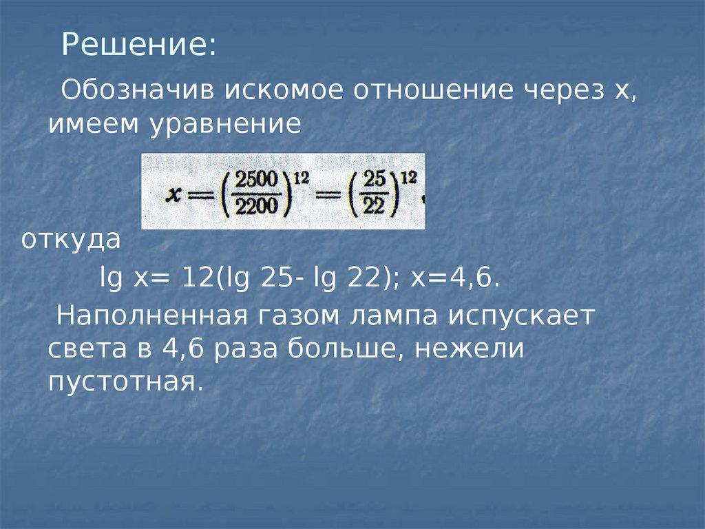 lg x= 12(lg 25- lg 22); х=4,6.